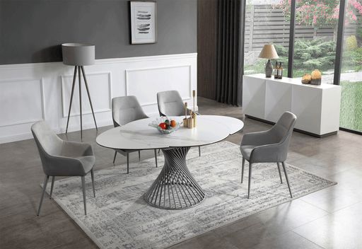 View full details1- 9087 Dining Table White (Qty 1)Width: 83/123, Depth: 43, Height: 31, SKU: i37528Two 20'' ExtensionsDescriptions:Elegant extended ceramic top whi...