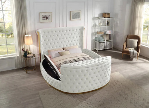 Cannes Queen Crean Platform TV BedDescription: -Available in 4 colors-Velvet squared bed with upholstered lid-Electronic Tv Storage pop up-Tv inser...