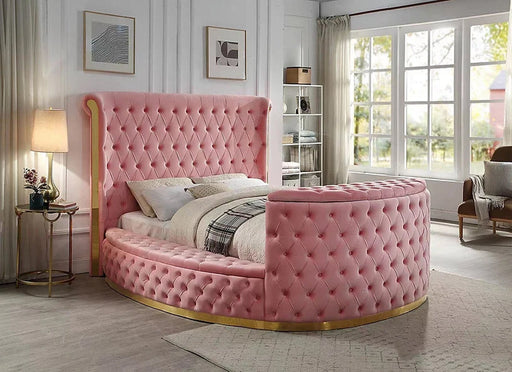 View full detailsCannes Queen Pink Platform TV BedDescription: -Available in 4 colors-Velvet squared bed with upholstered lid-Electronic Tv Storage pop up-Tv insert...
