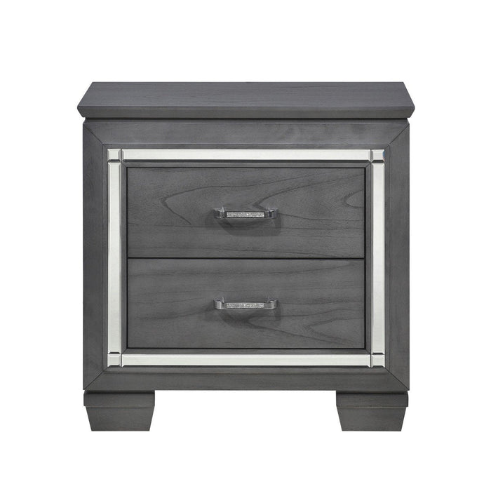 Glamour reigns in the design of the Allura Collection. Each piece is framing a decorative beveled mirror accent that enhances the illumination from the touch-engaged LED back-light of the headboard and mirror, as well as the under-light of the night stand. Alligator embossing and high polished crystal elevates hardware boldly accent the newly available gray finish - over mindy veneer - of the collection. The Allura Collection is also available ineither a Silver or Black finish. Providing additional glamour and functionality to your bedroom are the vanity, stool and decorative bench. The vanity features behind-the-mirror jewelry hooks, drawer storage, tri-fold mirror and a glass shelf that connects the drawer units. Both the bench and vanity stool feature crystal button tufting for an added hint of sparkle.