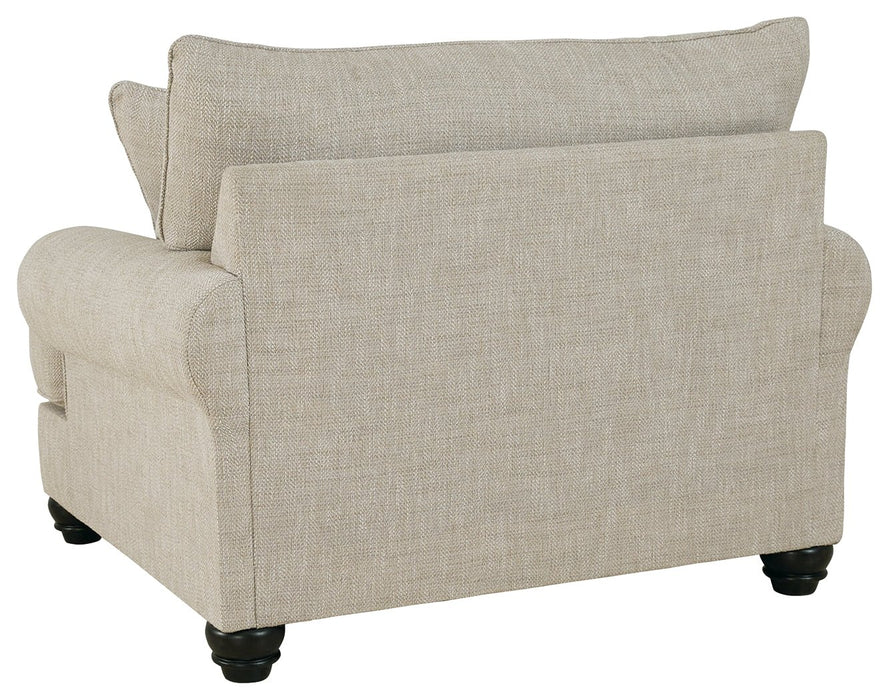This oversized chair has an alluring look that's guaranteed to turn heads. Richly textured fabric in a light, easygoing hue is enhanced by even lighter flax peeking through. Distinctive roll arms add a dab of debonair, while indulgently plush cushions cradle you softly. Sit back and relax in comfort and style, with plenty of room to stretch out and unwind at the end of a long day.