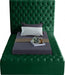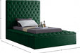 Extend elegance to the bedroom with this Bliss Green velvet bed. This bed has a rich look, with deeply tufted upholstery along its upper platform perimeter and headboard, ensuring that it is a good fit in modern bedroom themes. Storage rails and footboard are included to ensure maximum versatility, and the bed comes with full slats, so you can use it without a box spring. The green velvet fabric used in its design makes it easy to integrate alongside other furnishings.