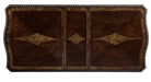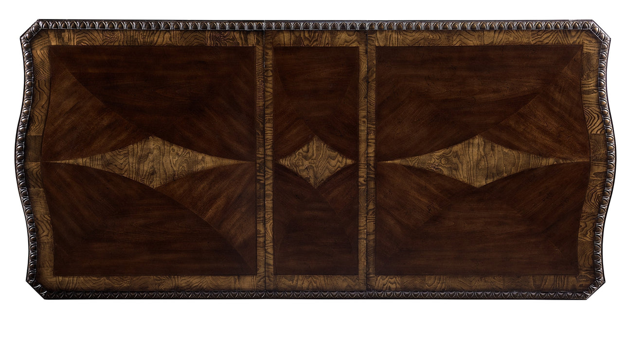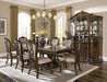 With styling that exemplifies traditional design, the Bonaventure Park Collection exudes sophistication and refined elegance. Cantered pilasters frame the serpentine fronted china and server, while egg and dart molding, acanthus leaf motif and bale, and button hardware lend to the traditional look of all pieces. Burl inlay creates beautiful contrast to the gold-highlighted cherry finish of the collection. Two table options provide flexibility for placement in your dining space the first, a 110-inch double pedestal base rectangular top table, the second, a 76-inch oval top single pedestal base table. Button-tufted traditional tweed fabric features prominently on the accompanying wood-framed chairs.