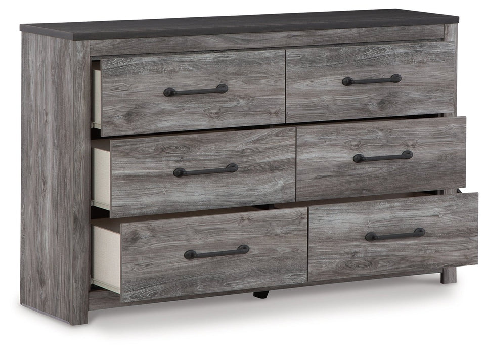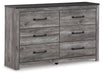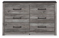 Dresser only Expertly made with engineered wood (MDF/particleboard/plywood) for the right balance of affordability and durability Decorative laminate veneer replicates natural or man-made material surfaces with consistent color, pattern and texture Two-tone look: smoky gray replicated oak grain accented with rustic charcoal finish; replicated oak grain with authentic touch Large-scaled handles in a dark hue 6 smooth-gliding drawers with dovetail construction Drawer interiors are lined with a faux linen laminate for a clean, finished look Framed front and pilasters Safety is a top priority, clothing storage units are designed to meet the most current standard for stability, ASTM F 2057 (ASTM International) Drawers extend out to accommodate maximum access to drawer interior while maintaining safety Assembly required