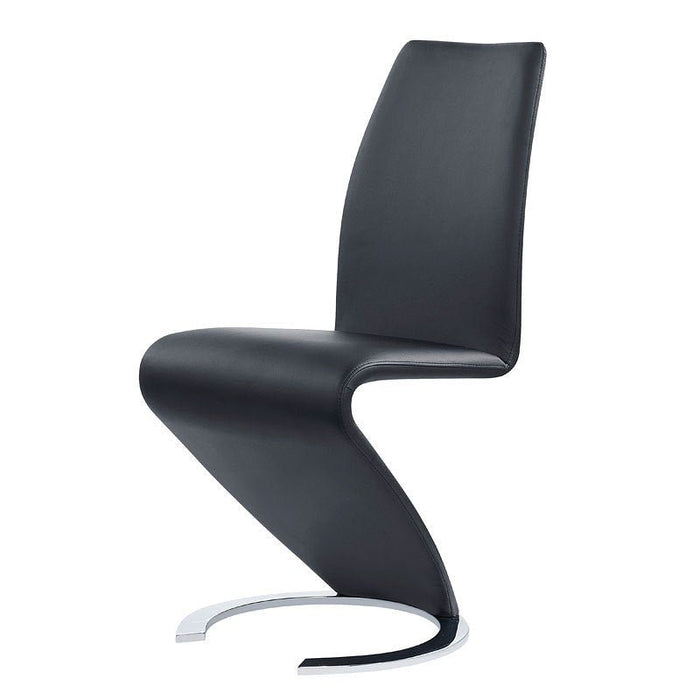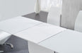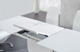 Inject your modern dining room space with a stylish new element when you add this contemporary dining set to your current setup. This beautiful set pictures of sleek and modern look with minimalist details that prove last really is more. A high gloss white finish with brushed stainless steel accents is sleek and on-trend. The glass top over white high gloss wood extends to accommodate all of your guests, and the self-storing butterfly leaf hides seamlessly just below the tabletop when not in use. The four chairs feature a sleek covering of upholstery with a diamond quilted pattern that runs from the top of the back down to the floor.