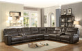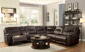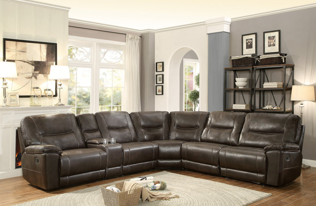 With a configuration options that allow for placement that is perfect for your space, the Columbus Collection will be a welcome addition to your living room. Ample seating is covered in either cobblestone fabric or dark brown breathable faux leather resulting in a pleasurable seating experience. Contrast stitching furthers the transitional look. Bookending this substantially sized seating group are the left or right end units that are offered as reclining chair or push back chaise. Armless chair, console unit, corner seat, and armless reclining chair make up the middle part of this sectional offering