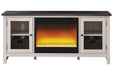 With its two-tone finish and minimalist charm, this TV stand with electric fireplace insert is right in tune with your relaxed approach to high style. Beautifully made to accommodate your media equipment, it’s well equipped with adjustable shelving, cutouts for wire management and a pair of glass-front doors that enhance the clean-lined aesthetic. The look is ideal for modern farmhouse and contemporary settings. Adding that much more show-stopping style: an electric fireplace insert that operates with or without heat and includes a six-level temperature setting, remote control and overheating control for added safety. The fireplace insert comes with optional faux glass crystals and natural stones, so you can customize the look of the flame bed.