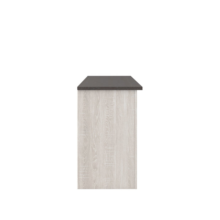 Made of decorative laminate and engineered wood;Two-tone finish (replicated gray wood top and antique white base);Pair of glass inset doors;Adjustable center shelf; 2 side shelves;Cutouts for wire management;Compatible with our W100-02 and W100-101 fireplace insert (sold separately);Assembly required