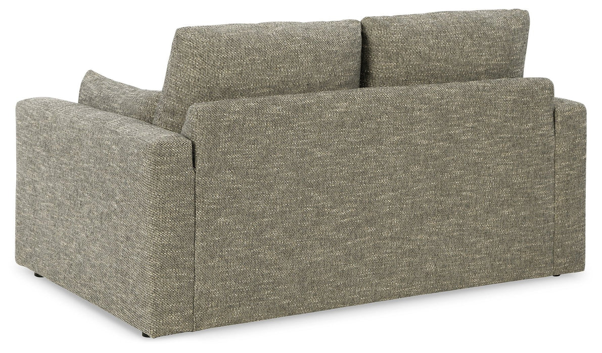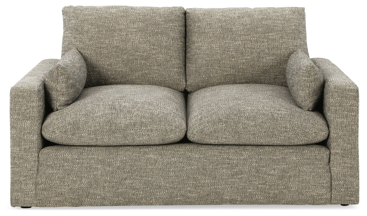 On the days when rest and relaxation seem out of reach, this loveseat provides a positively plush seating experience. Its feather-fiber blend cushions invite you to float away in cloud-like comfort. Striking granite-hued upholstery and a streamlined frame grant this cozy piece a look well-suited to contemporary spaces.
