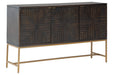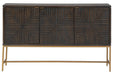 This accent cabinet is a versatile stunner with 3 geometric patterned door fronts in warm dark brown accented with goldtone finish metal hardware. Standing on a goldtone metal open frame base, the three-door console is aesthetically contemporary and sophisticated, ready to serve as buffet, console or media cabinet.