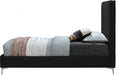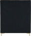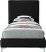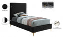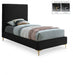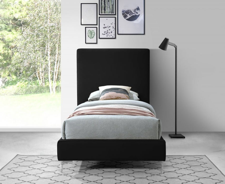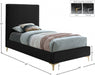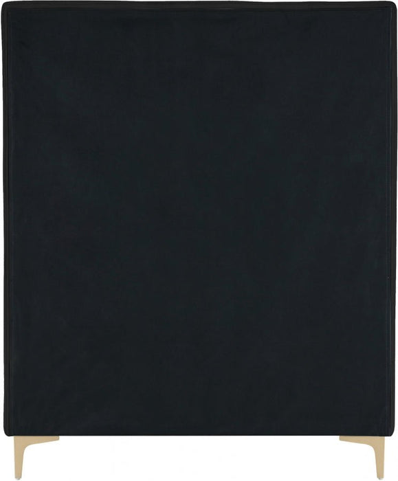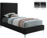 Provide yourself with a few options when you choose the sleek Geri black velvet twin size bed. The headboard, side rails and footboard are all cushioned and upholstered, with snazzy decorative piping on the headboard and footboard. This bed comes with two different sets of legs so you can match your other decor. Use the gold ones, the chrome ones, or two of each color for a truly contemporary approach.