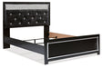 Rest easy. The luxurious look you’ve been dreaming of is yours for the taking, at a price sure to put you at ease. This queen upholstered panel bed brings a sense of old Hollywood with a contemporary flair. A deep, dark finish, faceted chrome-tone accents and LED lighting exude Hollywood-chic style to the max. Padded windowpane stitching on the sleek black upholstery infuses a sumptuous look that’s upscale and indulgent, and utterly on trend. A wireless remote allows you to control the color and brightness to suit the mood.