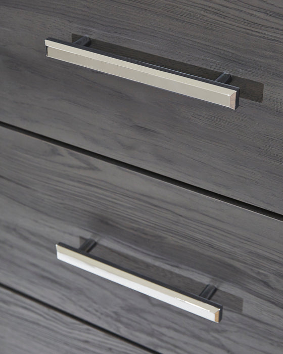 Modern gray finish with replicated wood grain. Cases and bed are accented with faceted chrome details. Large scaled chrome handle with faceted details. Headboards are accented with LED lighting and include a remote for color and brightness options. Headboards are accented with faux crystal tufted black upholstery. Side roller glides for smooth operating drawers. Drawer interiors are lined with a faux linen laminate for a clean finished look. Both USB and Qi wireless charging options are provided with the night stand.