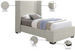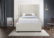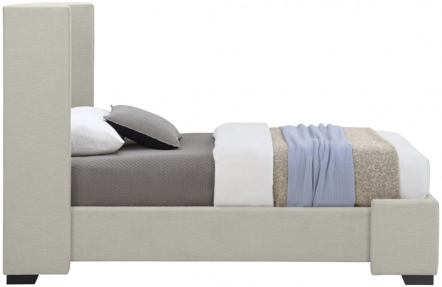 Treat yourself to a fresh new look in your bedroom sanctuary with this twin-size Oxford linen textured bed. This bed features an oversized wing-back headboard for a majestic appearance and is upholstered in rich beige linen textured fabric all over, adding an element of elegance to your room. The espresso legs contrast nicely with the fabric, bringing this midcentury modern design to life. As a bonus, this bed requires no box spring.