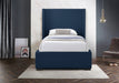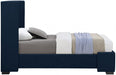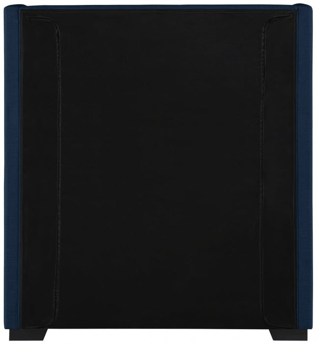 Treat yourself to a fresh new look in your bedroom sanctuary with this twin-size Oxford linen textured bed. This bed features an oversized wing-back headboard for a majestic appearance and is upholstered in rich navy linen textured fabric all over, adding an element of elegance to your room. The espresso legs contrast nicely with the fabric, bringing this midcentury modern design to life. As a bonus, this bed requires no box spring.
