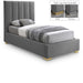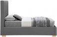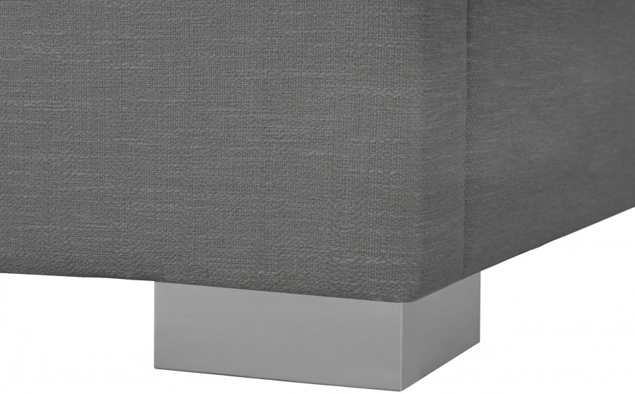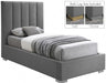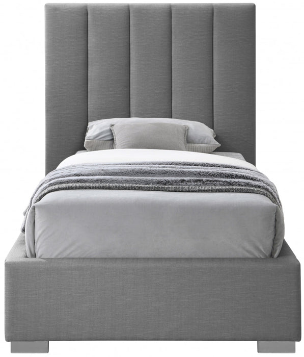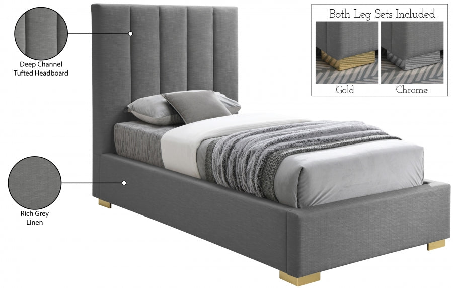 Give your bedroom a facelift with this Pierce linen textured bed. This twin-size bed features elegant grey linen textured upholstery that runs from its headboard, down its sides to its footboard, adding a sophisticated feel to your space. Deep channel tufting on the super tall headboard adds to its regal look, and it comes with both gold and chrome legs, so you can give it a personalized spin to match your decor preferences.