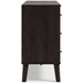The perfect marriage of simple and contemporary style, this dresser is a charming addition to your home. It features an expressive two-tone look, with a dark charcoal finish over replicated oak grain with an authentic touch and a replicated sugarberry wood grain. Ball-bearing glides offer smooth opening and closing of the drawers, while matte black knobs and splay legs add a finishing touch.