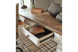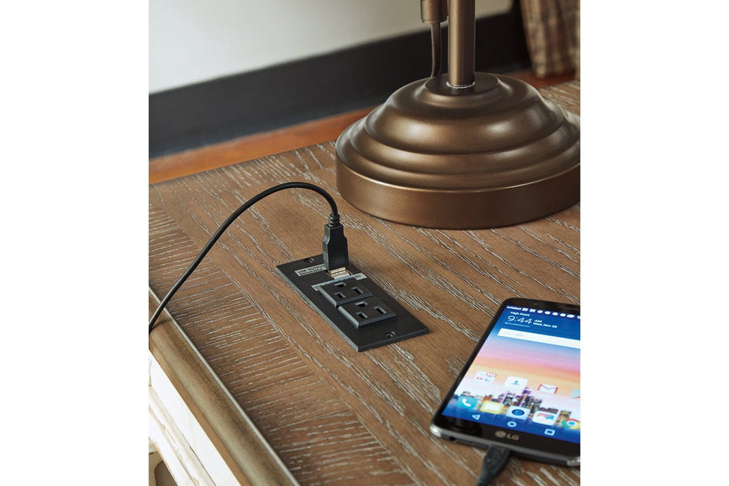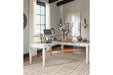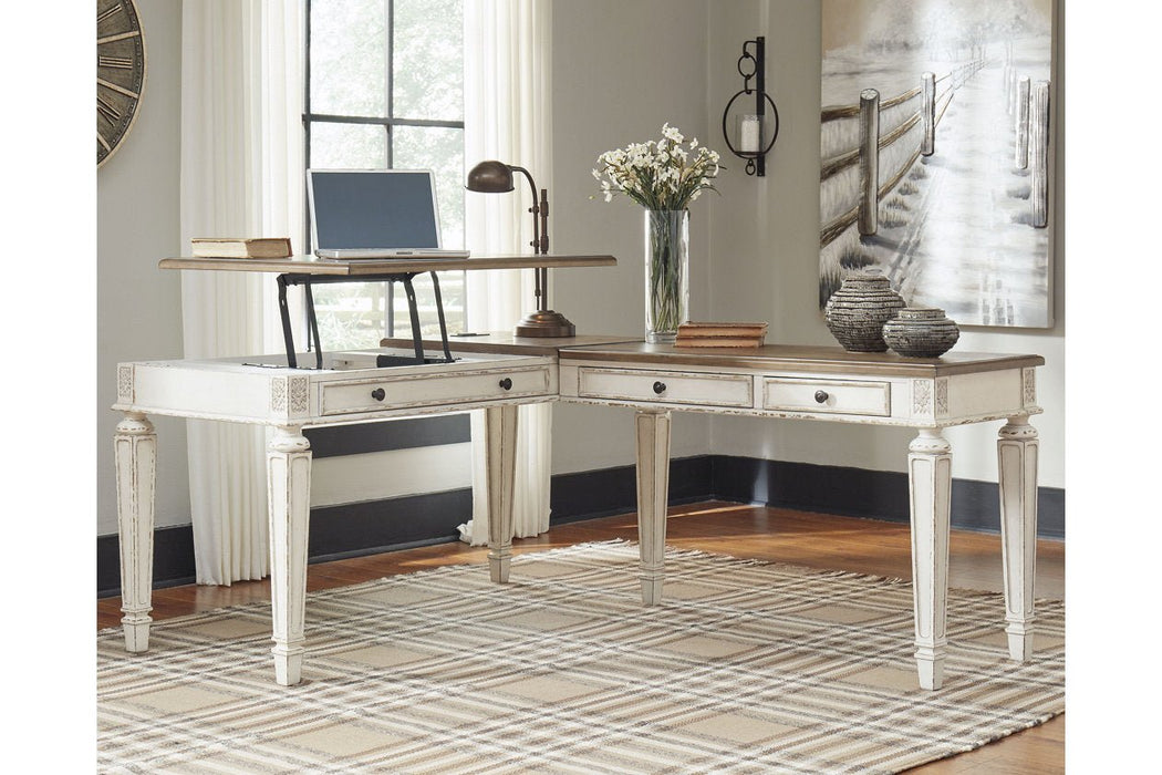 Elevating the art of traditional cottage styling, this L-shaped desk is your heavenly home office realized. Two-tone finish combines chipped white with distressed wood tone tops for added charm. Framed drawer fronts, decorative corbels and elegantly turned and tapered legs add refinement, while dark bronze-tone knobs lend a classic touch. Spring lift top raises the surface to a comfortable standing position, for a healthy alternative. Built for looks and productivity, the built-in power supply and dual USB ports keep your devices close at hand and ready to go.