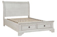 Elegant, timeless furnishings take your bedroom to the next level. Nothing does that better than this full sleigh bed with storage footboard. The antiqued white finish with a wonderful grain texture oozes sophistication, while drawers with dark bronze-tone knobs add a sophisticated touch. Rounding things out, the subtle curve of the headboard keeps the look polished and poised.