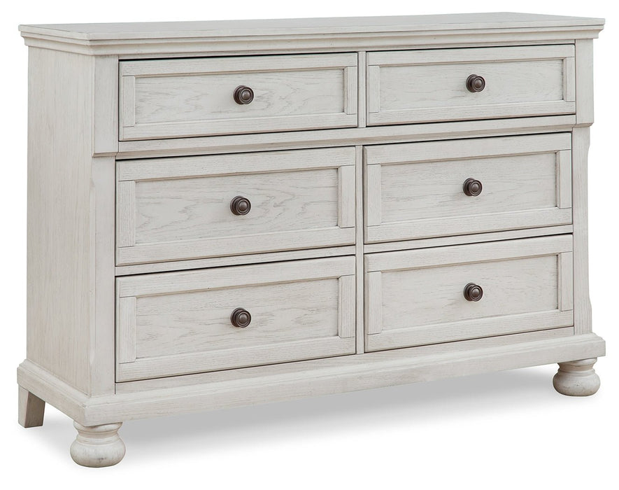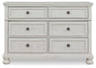 Dresser only Made with wood, select oak veneer and engineered wood Antiqued white finish with grain texture 6 smooth-gliding drawers with metal ball-bearing side glides (upper drawers with felt bottoms) Dark bronze-tone knobs Assembly required