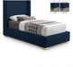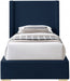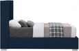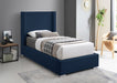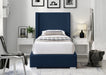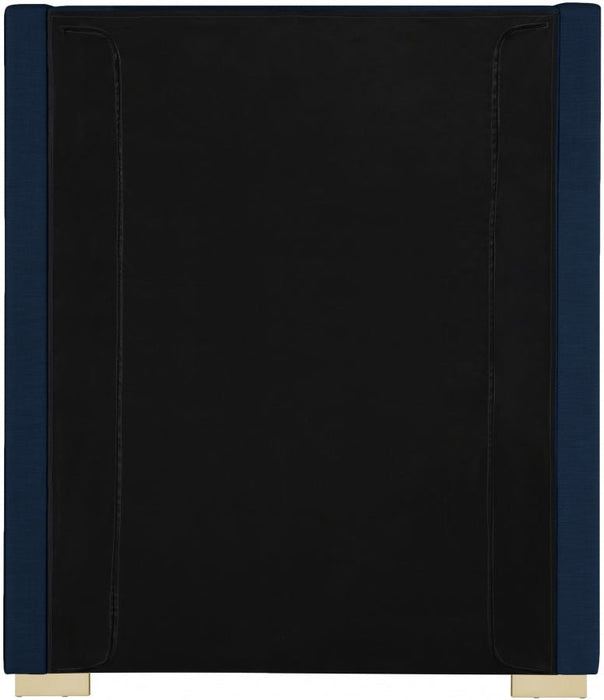 Make a big impression in the bedroom with this twin-size Royce linen textured bed. A wingback headboard is the star of the show here, with its extra height adding an element of drama to this exceptionally crafted bed. The headboard, sides and footboard of this Royce bed are covered in rich navy linen textured fabric for a sleek yet chic touch. The bed comes with both gold and chrome legs to suit your style preferences.