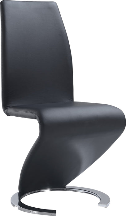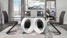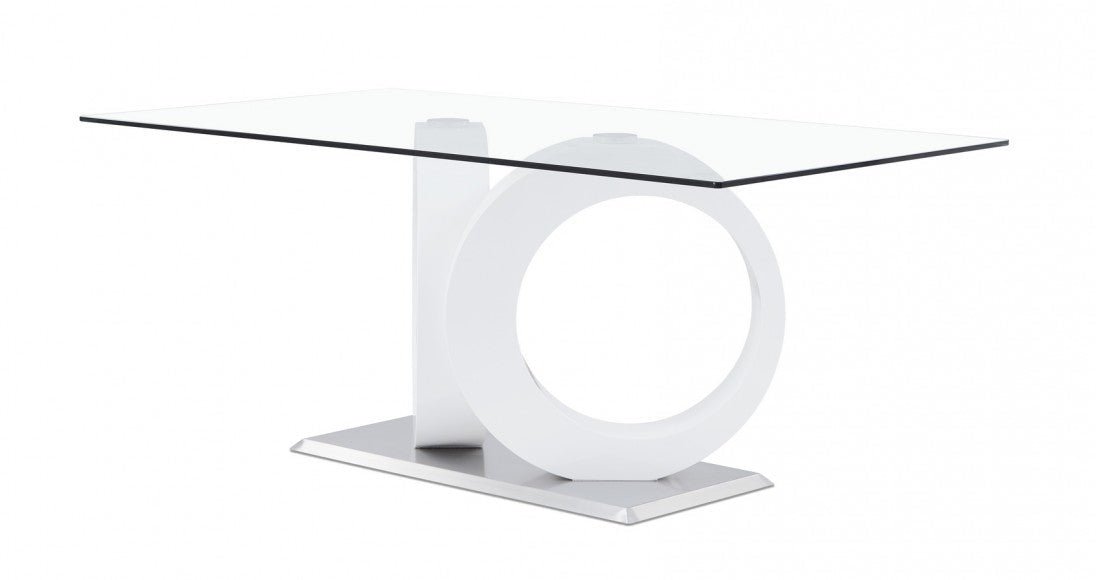 Commit to this stunning white double ring dining set with a clear glass top table with a double ring column and angular S-shaped chairs. The base of the table is a clean, high gloss white, which perfectly matches the dining chairs and gives your dining area a light appearance. The glass table top gives you a clear view of the double ring base below it, so you can admire the full beauty of this piece while you dine. Paried with the black s shaped chairs you have a set to enjoy.
