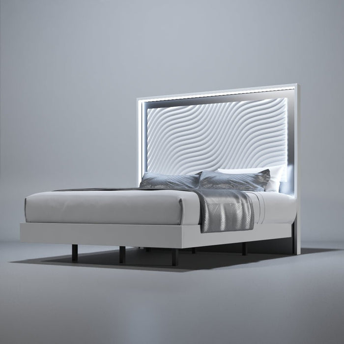 MADE IN SPAIN One of a kind modern design bedroom with wave shapes in White. The Bedroom Furniture Set consists of Queen Size Bed, Nightstand, Dresser and Mirror. The Bed is available in Queen and King Sizes. The 6-Drawer Chest to match with the standing mirror