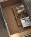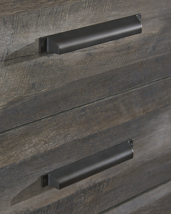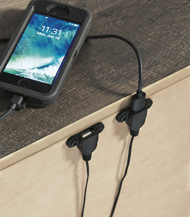 Rustic gray planked replicated oak grain with authentic touch. Large scaled dark colored hooded pull. Side roller glides for smooth operating drawers. Cases feature a framed front and pilasters. Large drawers provide ample storage space. Slim profile dual USB charger located on the back of the night stand tops.